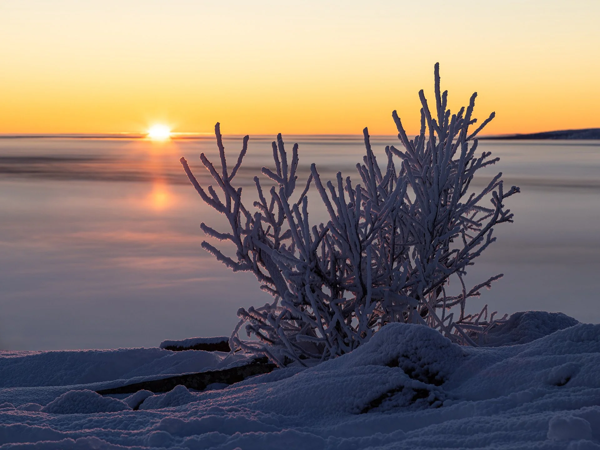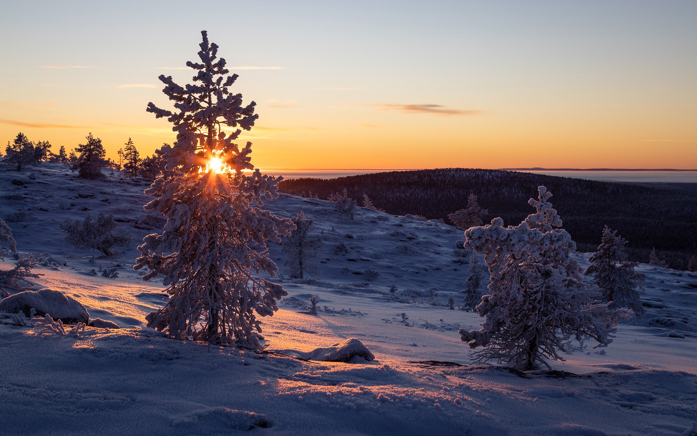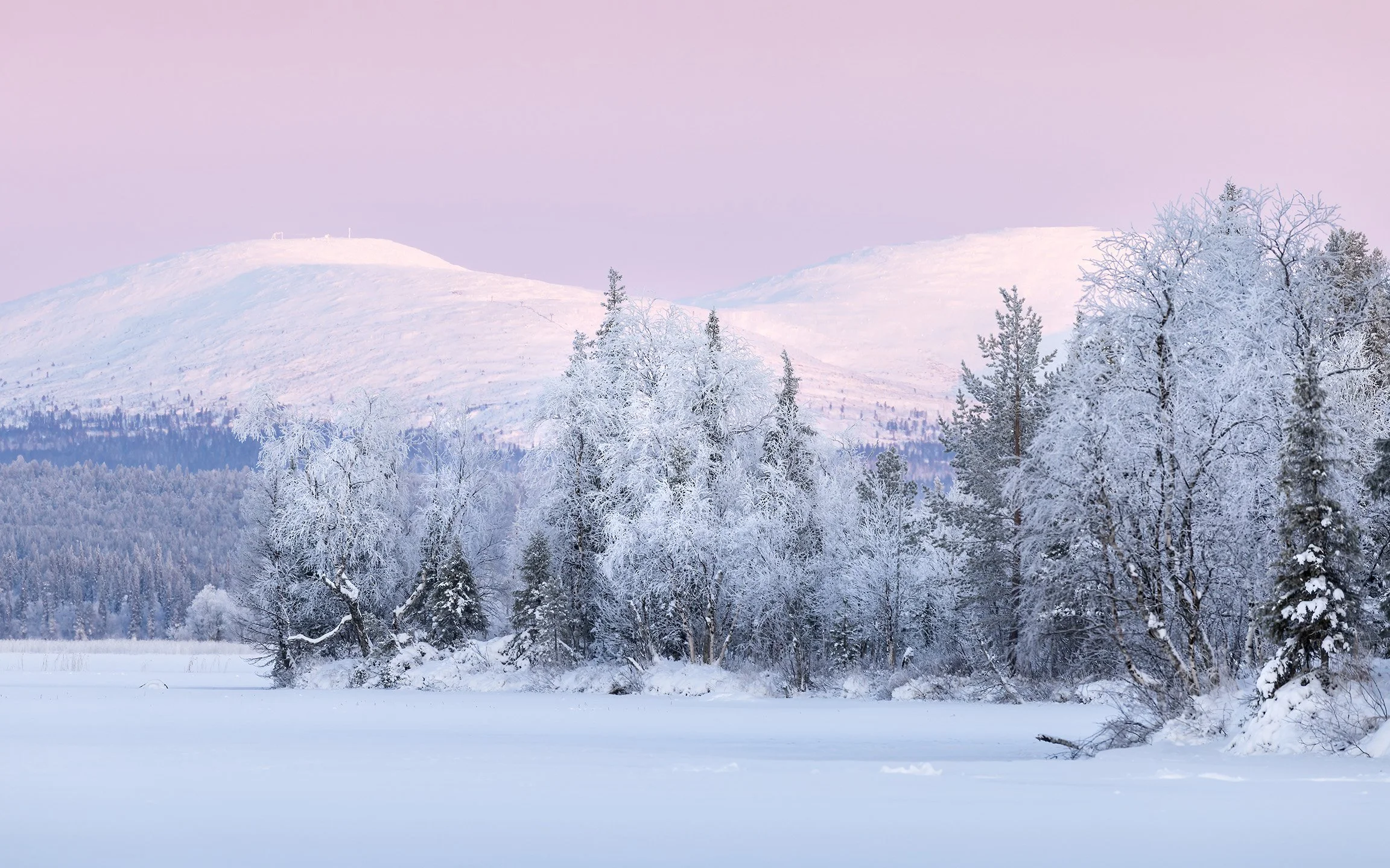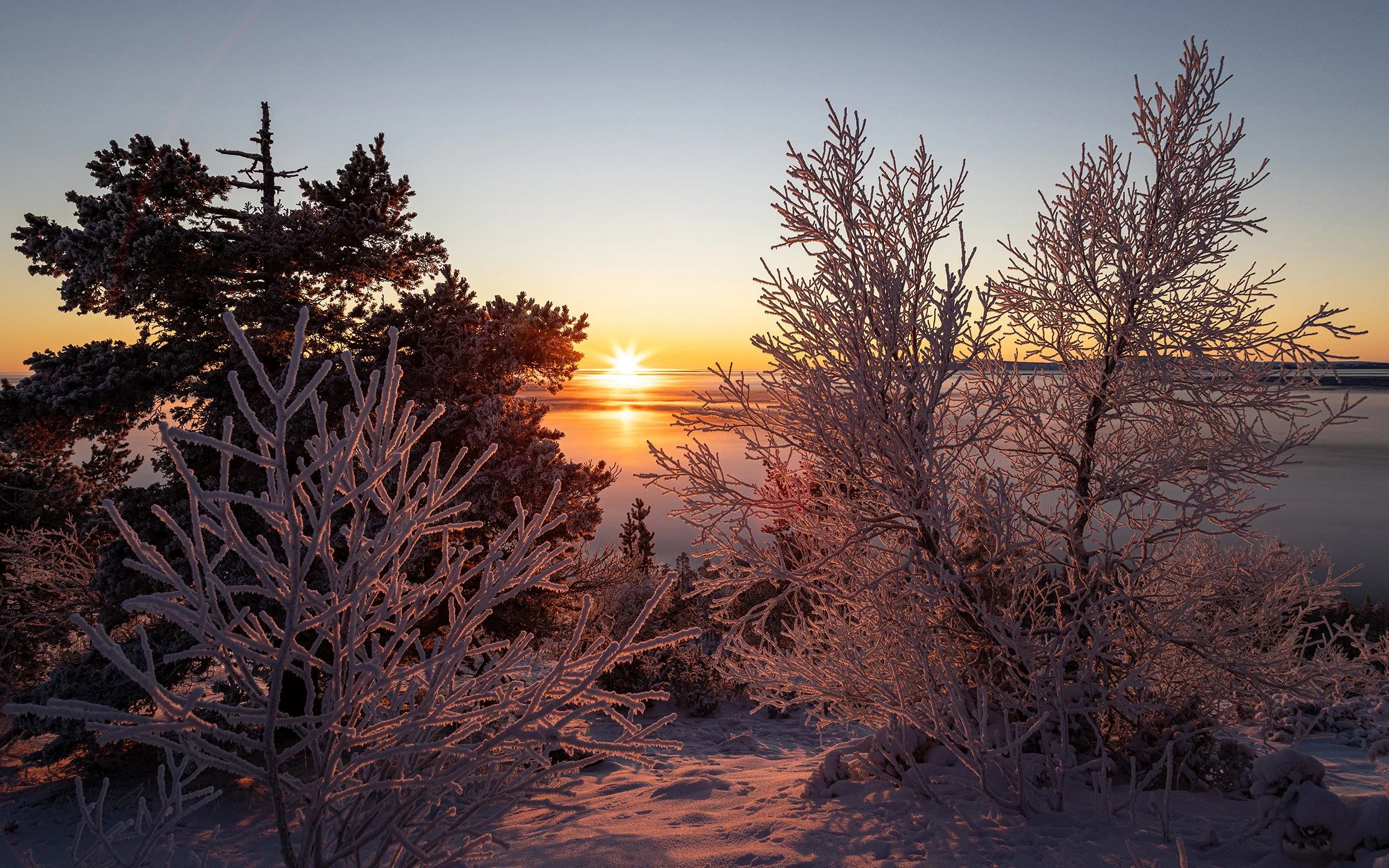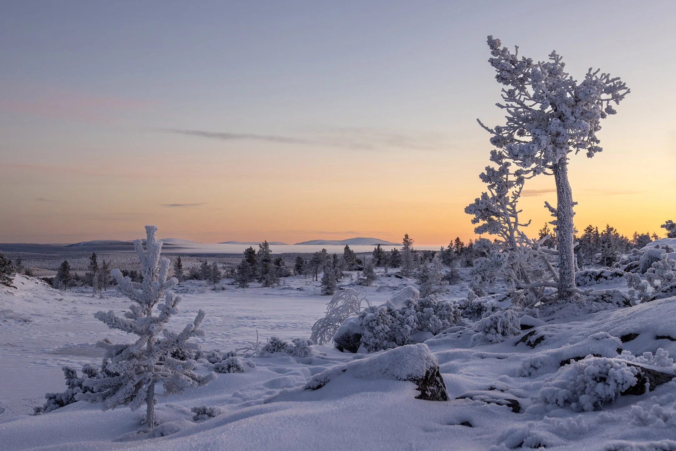 A short walk through the woods from the cabin brought us to the frozen shores of Lake Jerisjärvi. The frost-covered trees in front of the fells of Yllas National Park made for a serene scene.