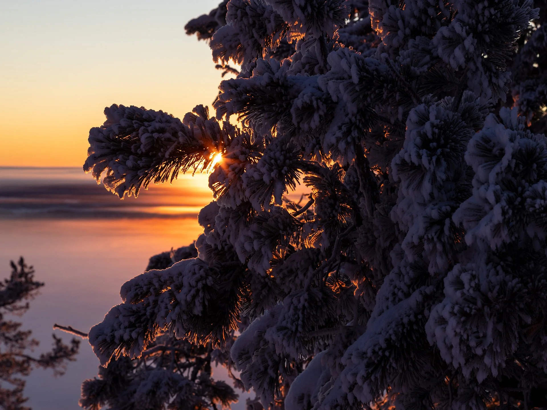 Sunset shining through snow-draped trees.