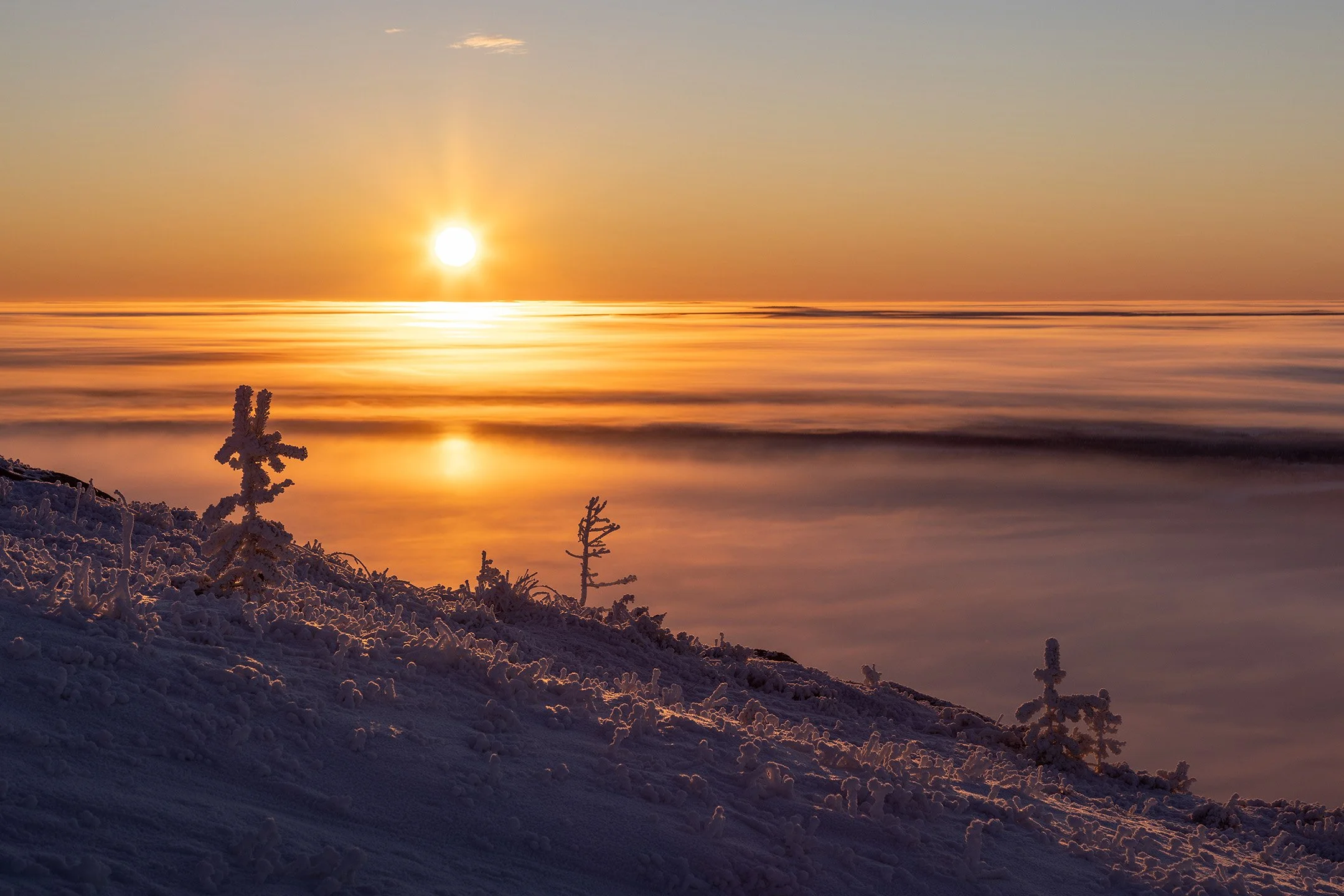 The sky turned a delicate golden yellow as the sun hung on the horizon, before finally setting beyond the layer of fog.