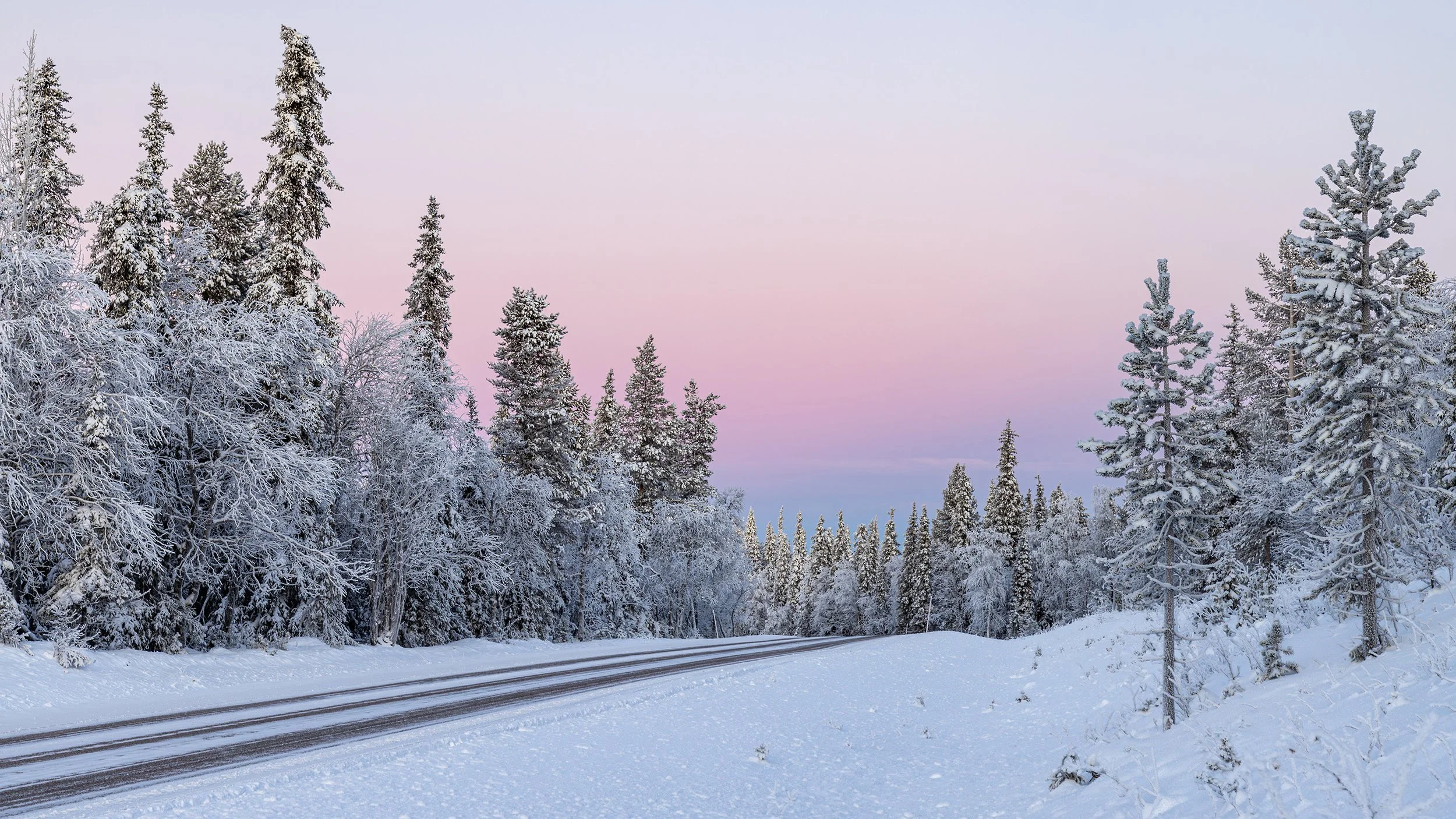 On the road to Pallas National Park, with the road leading through the snow-covered trees to the beautiful pastel shaded sky.