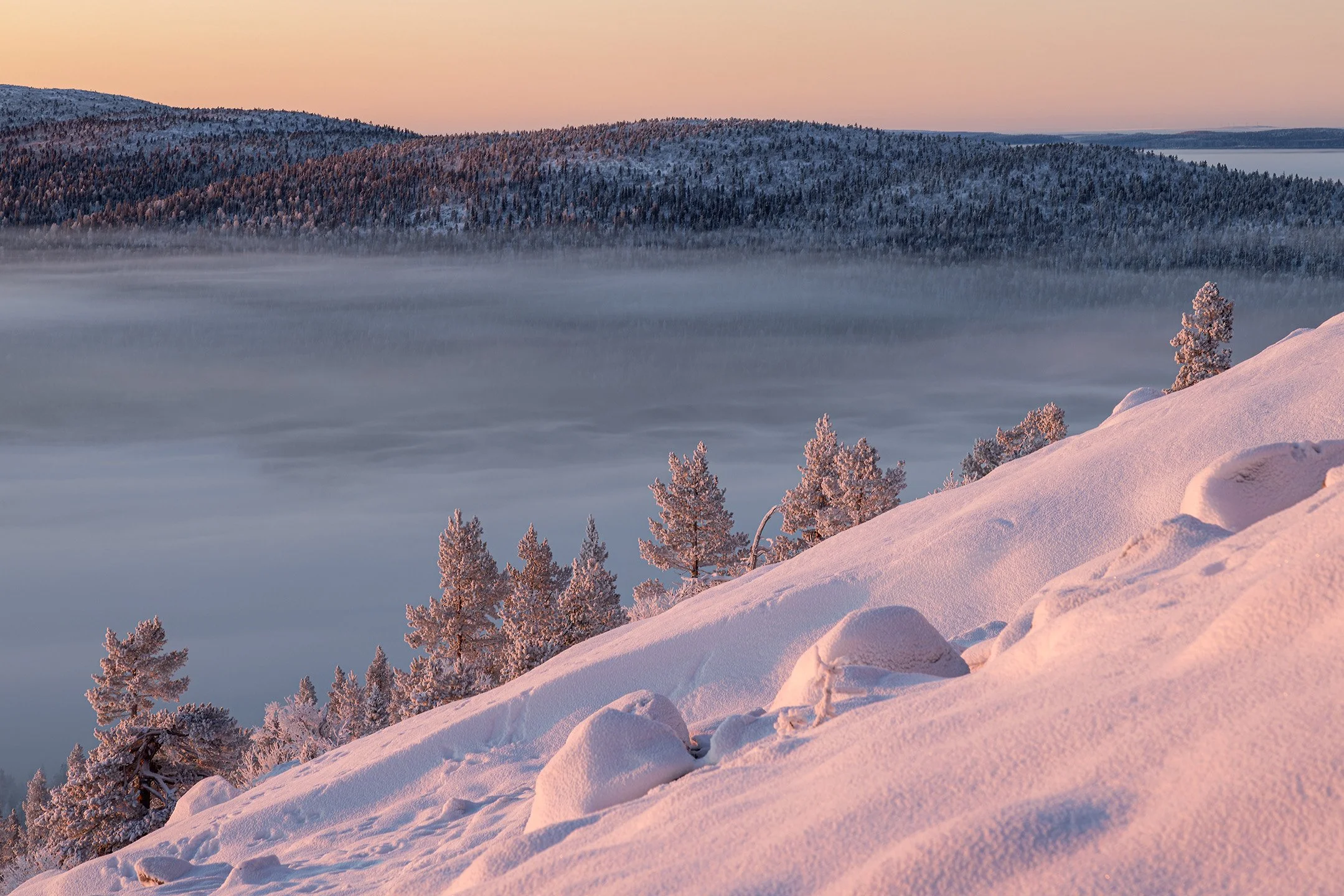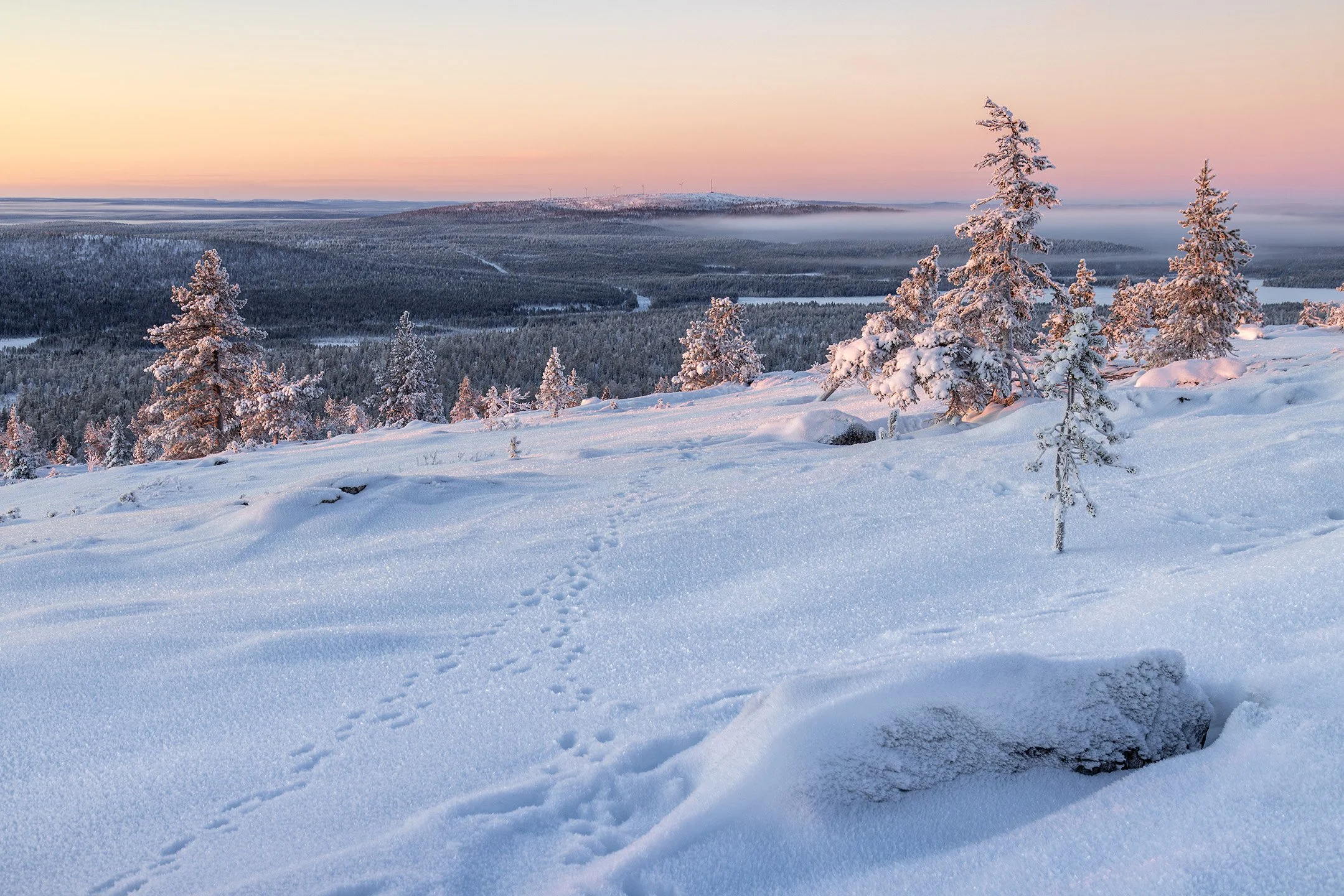 Arctic hare prints lead into this scene with fog hanging over the distant trees.