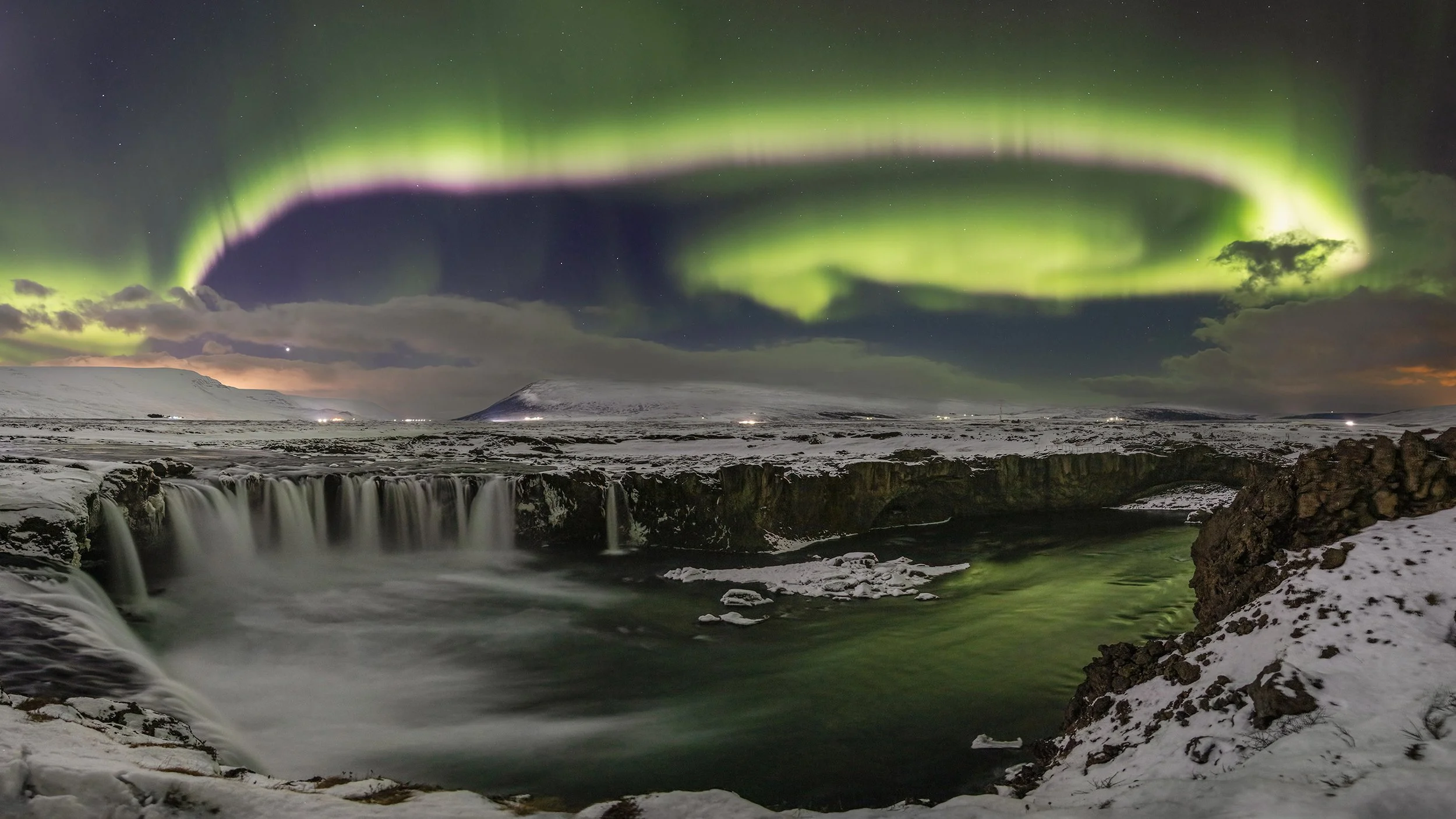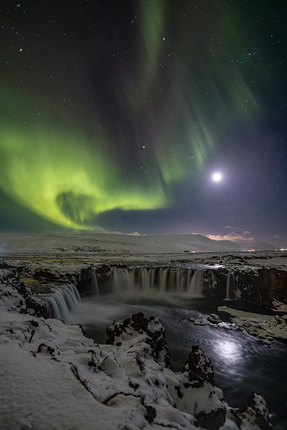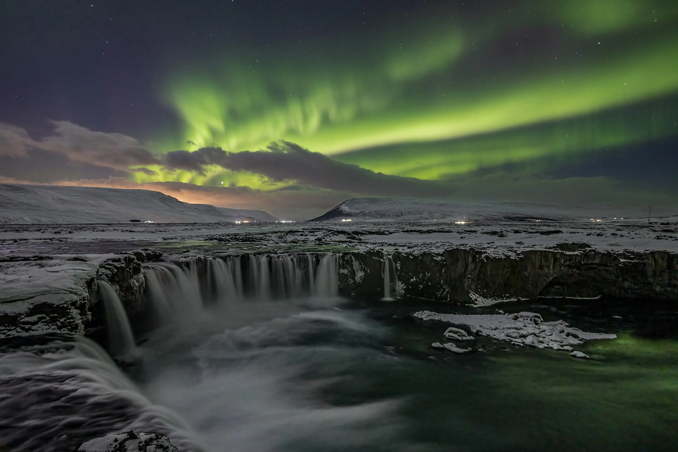 Aurora over Goðafoss Waterfall in Northern Iceland